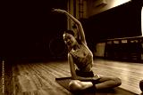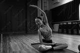 Calm female athlete practicing side stretch pose during yoga session in a modern fitness studio