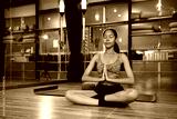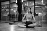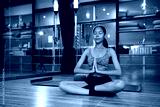 Peaceful female in sportswear sitting on yoga mat with hands in prayer pose, practicing mindfulness