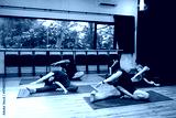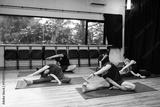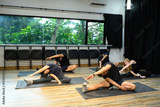 Diverse group of people practicing seated side stretch pose together on mats in a calm studio