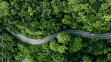 Forest road ,Top view of road in the middle of the forest curve construction up to mountain, panoramic view of Rainforest ecosystem elevated road that surrounds natural forest.