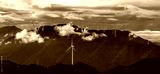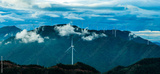 A wind farm with multiple turbines generating clean renewable energy on green mountains