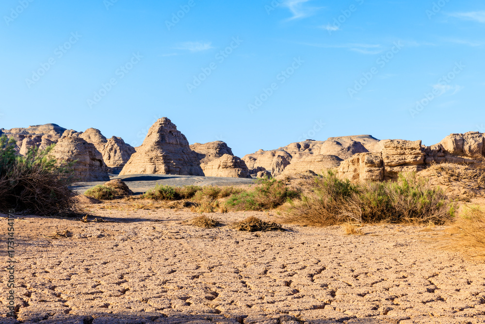Dry cracked earth and spectacular rock formations in the vast gobi desert. Famous Yardang landform mountain natural landscape in Xinjiang, China.