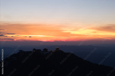 Dahong Mountain silhouettes against a vibrant sunset sky in Suizhou, China, showing mountain peaks and building structures at twilight.