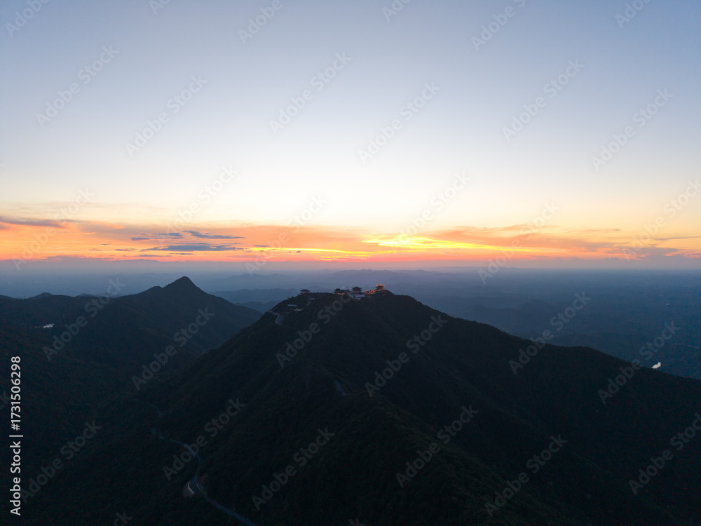 Dahong Mountain at dawn with peaks silhouetted against the colorful sky, offering a serene view of Suizhou, China's landscape.
