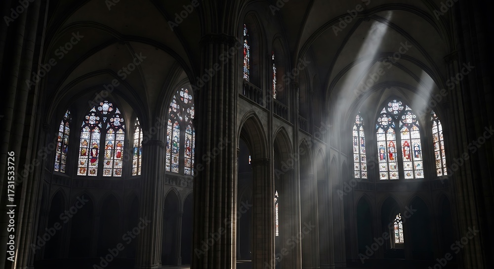 Sunlight streams through ornate stained glass windows illuminating the majestic interior of a gothic cathedral creating a serene and spiritual atmosphere.