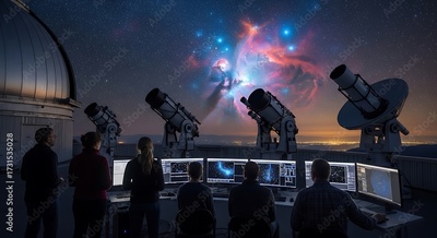 Scientists observing vibrant nebula and stars through telescopes at observatory with city lights below