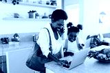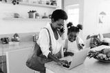 Busy mom's morning: Woman making a work call during family morning routine