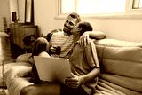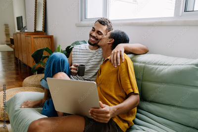 Gay couple relaxing together on a couch sharing a laptop and a coffee