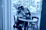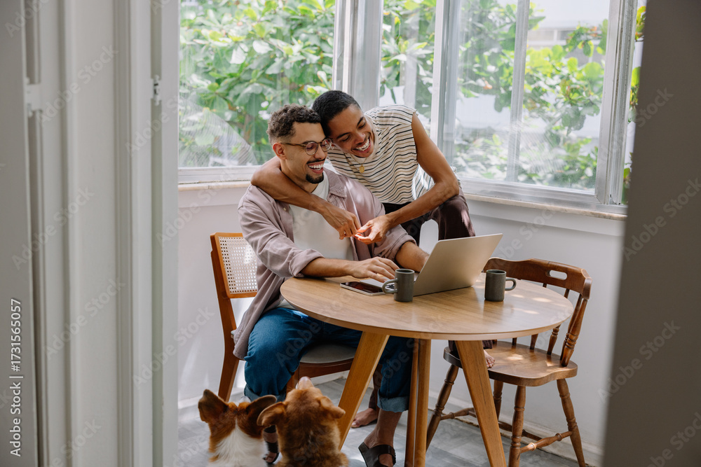 Relaxed gay couple working at home with their dogs in a bright setting