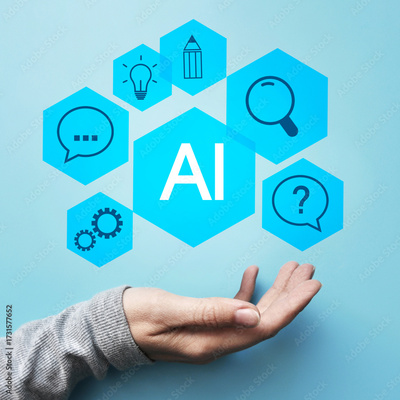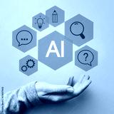 Futuristic Artificial Intelligence Infographic with Icons for Communication, Strategy, and Knowledge