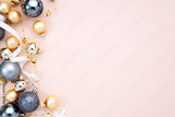 Christmas top view composition of tree balls empty copy space background. Xmas baubles flat lay border design empty space backdrop.