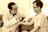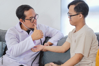 Doctor Asian Man Checking Pulse of Teenage Boy with Down Syndrome During Home Visit
