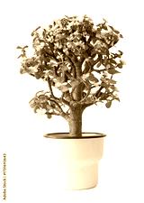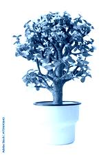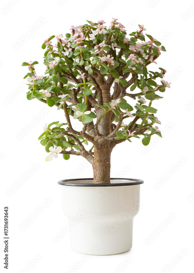 Blossoming succulent plant with thick stem and leaves potted as decorative houseplant isolated on white background