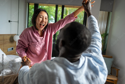 Young diverse multiethnic couple moving in new home. Couple is having fun in new house at moving day