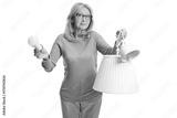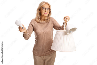 Confused woman holding a pendant lamp and a bulb