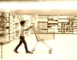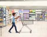Boy walking at a supermarket with a shopping cart