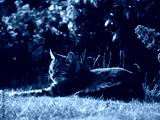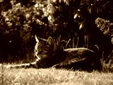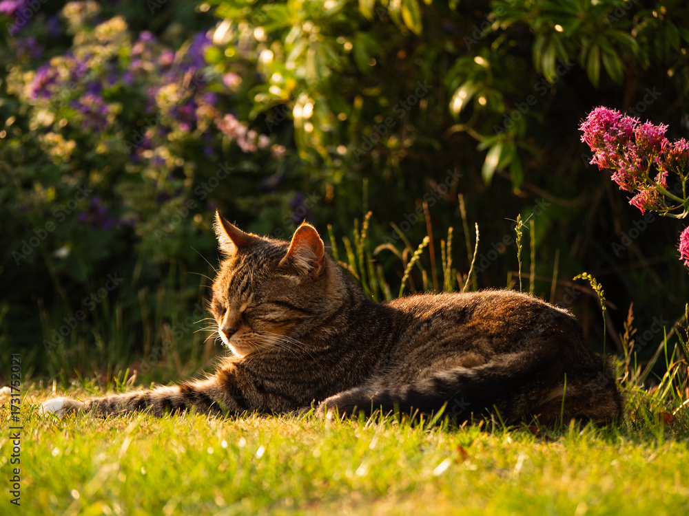 Tabby pet cat relaxing in a warm summer garden