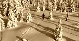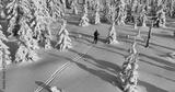 Aerial view of ski touring man crossing winter spruce forest, fresh snow. Clear sunny day, winter sport activity.
