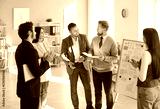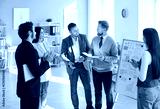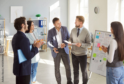 Group of cheerful business professionals standing near whiteboard during team meeting in modern bright office. Smiling colleagues discussing ideas, analyzing plans and presenting creative strategies.