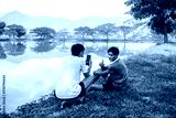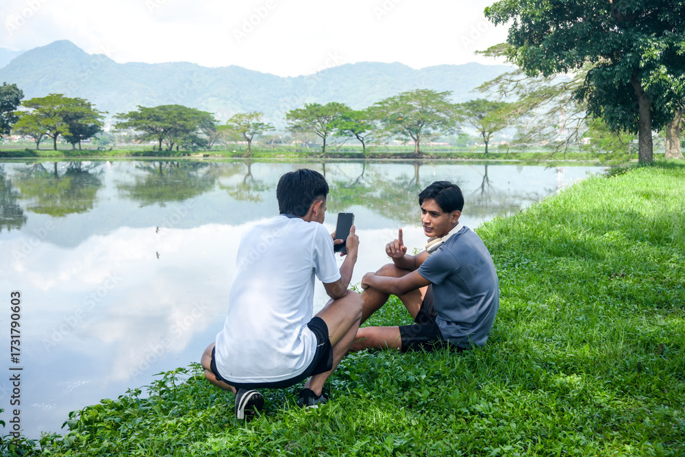 Two Friends Relax by a Lake, Sharing Moments and Taking Photos Using Smartphone