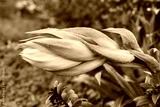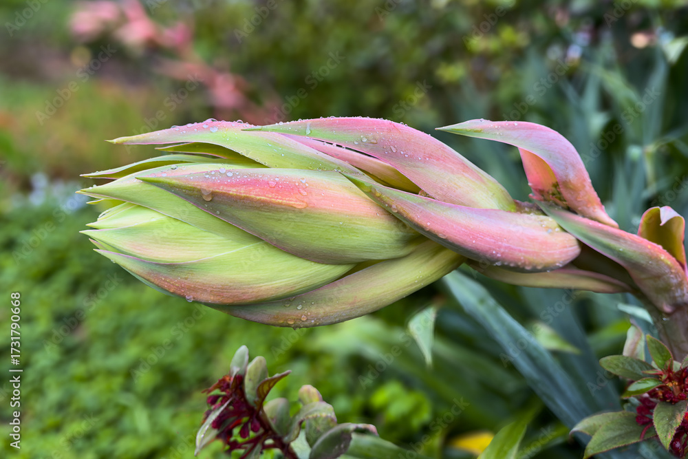 Mexican Lily, large flower stalk with rain drops. Dramatic, trifid-like succulent plant close-up. Beschorneria yuccoides. Spectacular flower spikes can grow to 3 metres. Member of Asparagaceae family.