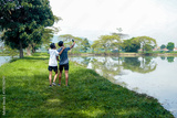 Back View of Two Men Take a Selfie by the Serene Lake, Enjoying Peaceful Nature Together