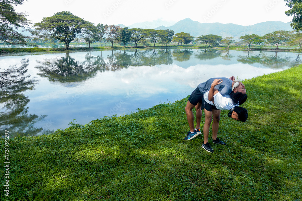 Two Male Friends Doing Acrobatic Human Bridge Pose on Lush Green Near Serene Lake