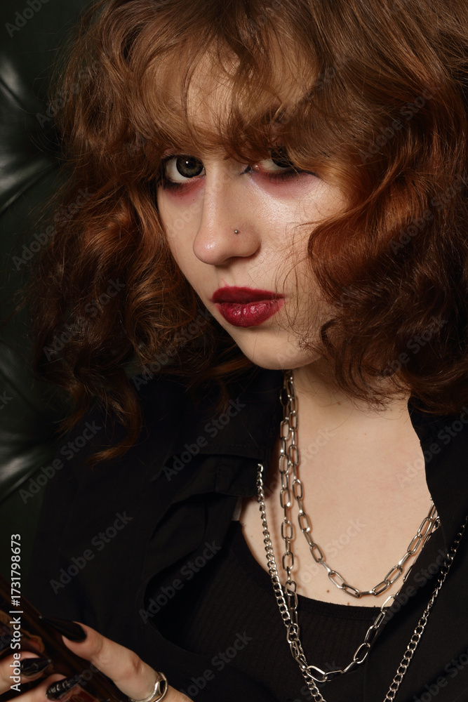 A portrait of a sad young girl with extravagant makeup, chains around her neck and a phone in her hands