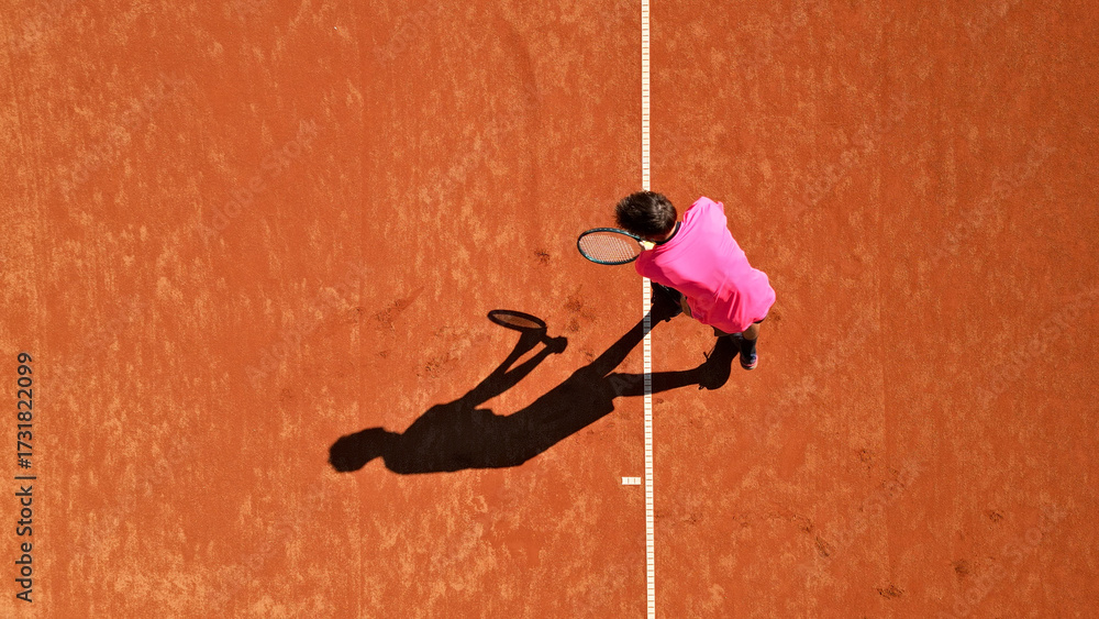 Tennis player in pink shirt practices on clay court, viewed from above. Flat lay photo highlights focused stance and shadow, emphasizing dedication and skill in sports training.