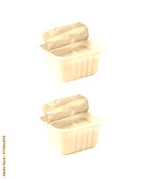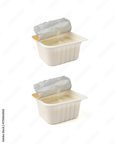 Yogurt cup isolated, yoghurt with orange fruits pieces in plastic pot, milk pudding container