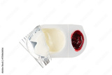 Yogurt cup isolated, white yoghurt with cherry jam in plastic pot, milk pudding container