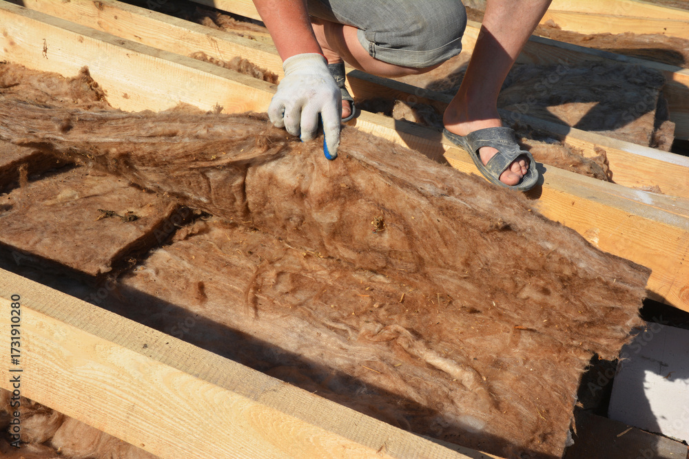 A builder checks the correctly laid layers of basalt rock wool thermal insulation on the roof.Basalt rock wool insulation is a mineral wool product made by melting natural basalt rock.