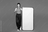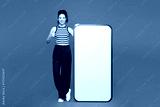 Full body young woman she wear blue tank top casual clothes big huge blank screen mobile cell phone smartphone with area show thumb up isolated on plain red orange color background. Lifestyle concept