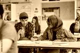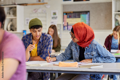 Teen students collaborating in class at high school