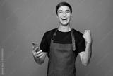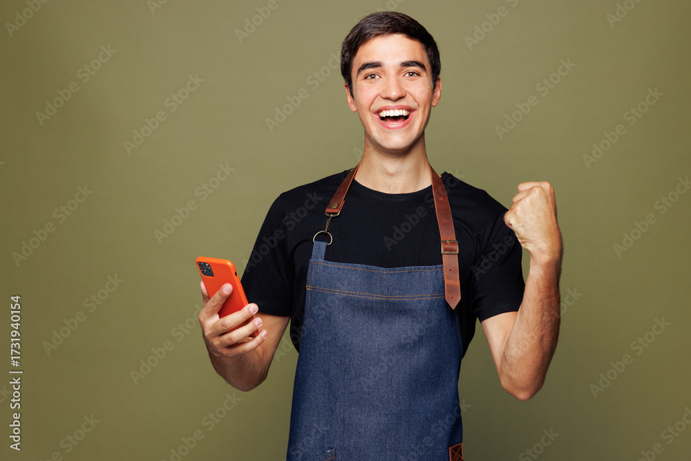 Young man barista bartender barman employee wear jeans apron t-shirt work in coffee shop hold use mobile cell phone do winner gesture isolated on plain green background Small business startup concept