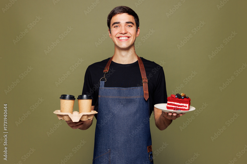 Young man barista bartender barman wearing jeans apron work in coffee shop holding takeaway delivery cup coffee to go, cake dessert isolated on plain green background. Small business startup concept.
