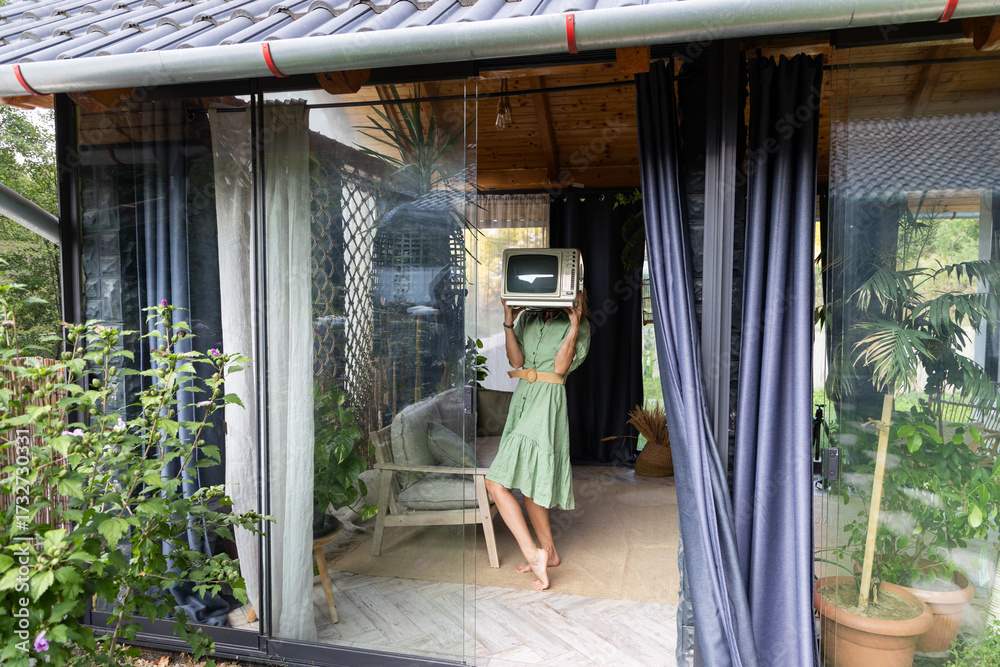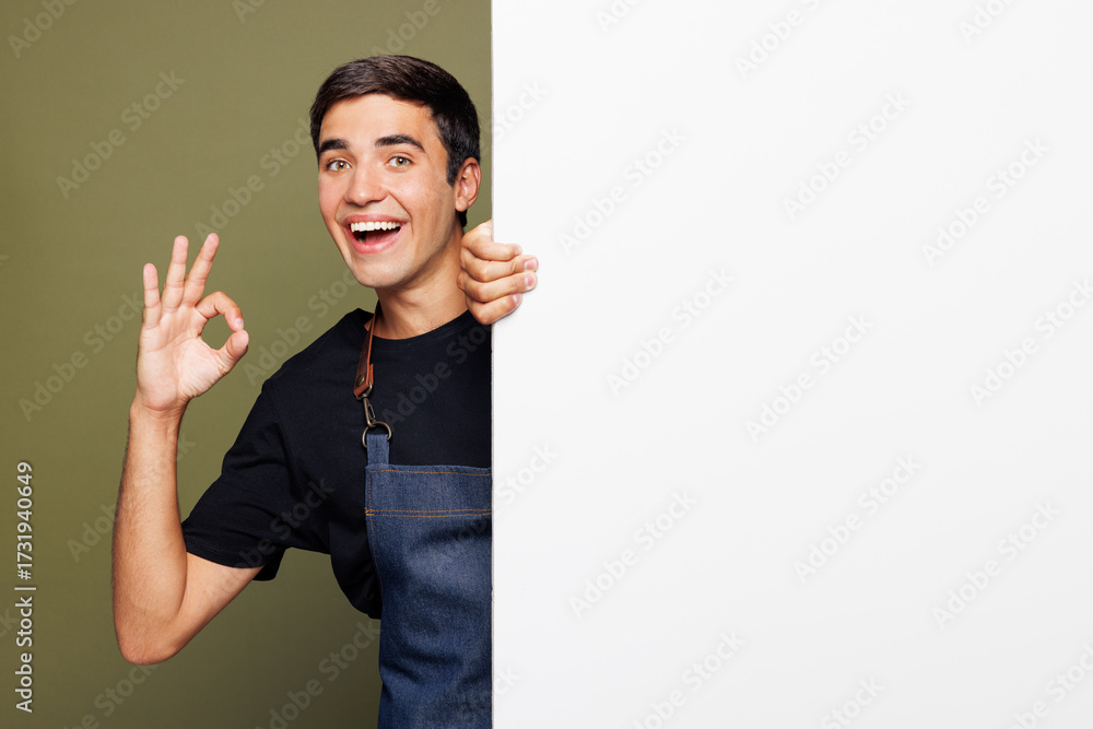 Young man barista bartender barman employee wear jeans apron black t-shirt work in coffee shop big white empty blank poster show ok isolated on plain green background. Small business startup concept.