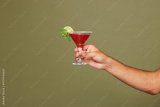 Close up cropped male barista bartender barman hold in hand glass of martini cocktail isolated on pastel plain green color background studio. Night club party concept. Copy space advertising mock up.