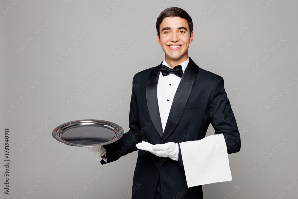 Young barista male waiter butler man he wearing shirt black suit bow tie elegant uniform work at cafe hold in hand show empty metal tray isolated on plain grey background. Restaurant employee concept.