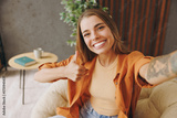 Close up young woman wear casual clothes do selfie shot on mobile cell phone show thumb up sits in chair stay at home hotel flat rest relax spend free spare time in living room indoor. Lounge concept.