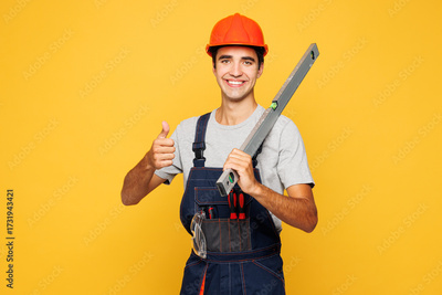 Young happy employee laborer handyman man wear helmet overall hold in hand spirit level isolated on plain yellow background. Instruments accessories for renovation apartment room. Repair home concept.