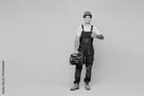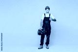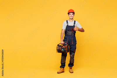 Full body young employee laborer handyman man wear helmet overall hold bag with tools show thumb up isolated on plain yellow background. Instruments for renovation apartment room. Repair home concept.
