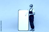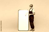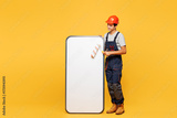 Full body young employee laborer handyman man wear helmet overall paint roller big huge blank screen mobile cell phone isolated on plain yellow background. Instruments for renovation apartment room.