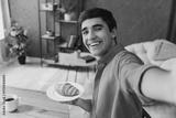 Close up young man wear casual clothes eat croissant do selfie shot on mobile cell phone sit alone at table in coffee shop cafe relax rest in restaurant in free time indoors. Freelance office concept.