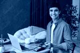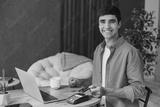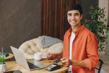 Young man wear casual clothes hold bank payment terminal to process acquire credit card sitting at table in coffee shop cafe relax rest in free time indoors. Freelance mobile office business concept.