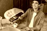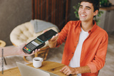 Young man wears casual clothes hold bank payment terminal process acquire cell phone sit at table in coffee shop cafe relax rest in free time indoor Freelance mobile office concept. Focus on object .