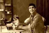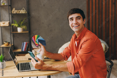 Young designer IT man in casual clothes work or study on laptop pc computer use cell phone choose color sit alone at table in coffee shop cafe relax rest in free time indoor Freelance mobile concept