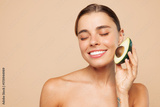 Beautiful half naked topless young woman 20s with nude make up hold avocado do face massage isolated on plain beige color background studio portrait Skin care healthcare cosmetic procedures concept.
