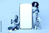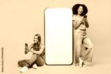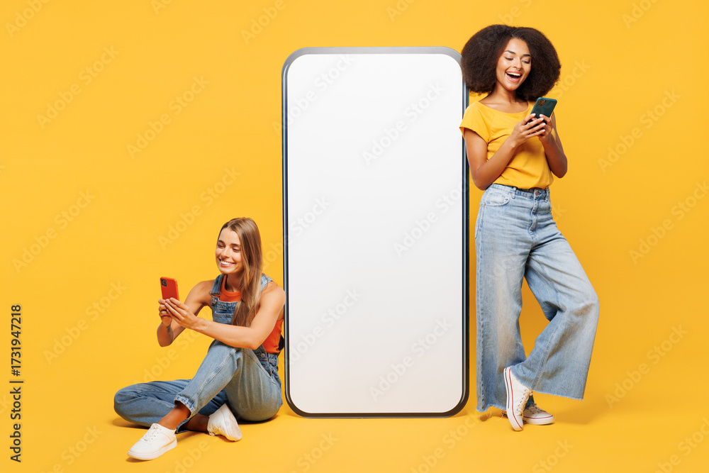 Full body two young friends buddies women wear denim casual clothes together big huge blank screen area mobile cell phone using smartphone isolated on plain yellow orange background Lifestyle concept