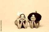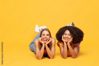 Full body two young friends buddies women wear denim casual clothes lay down together looking camera show tongue posing isolated on plain yellow orange background studio portrait. Lifestyle concept.